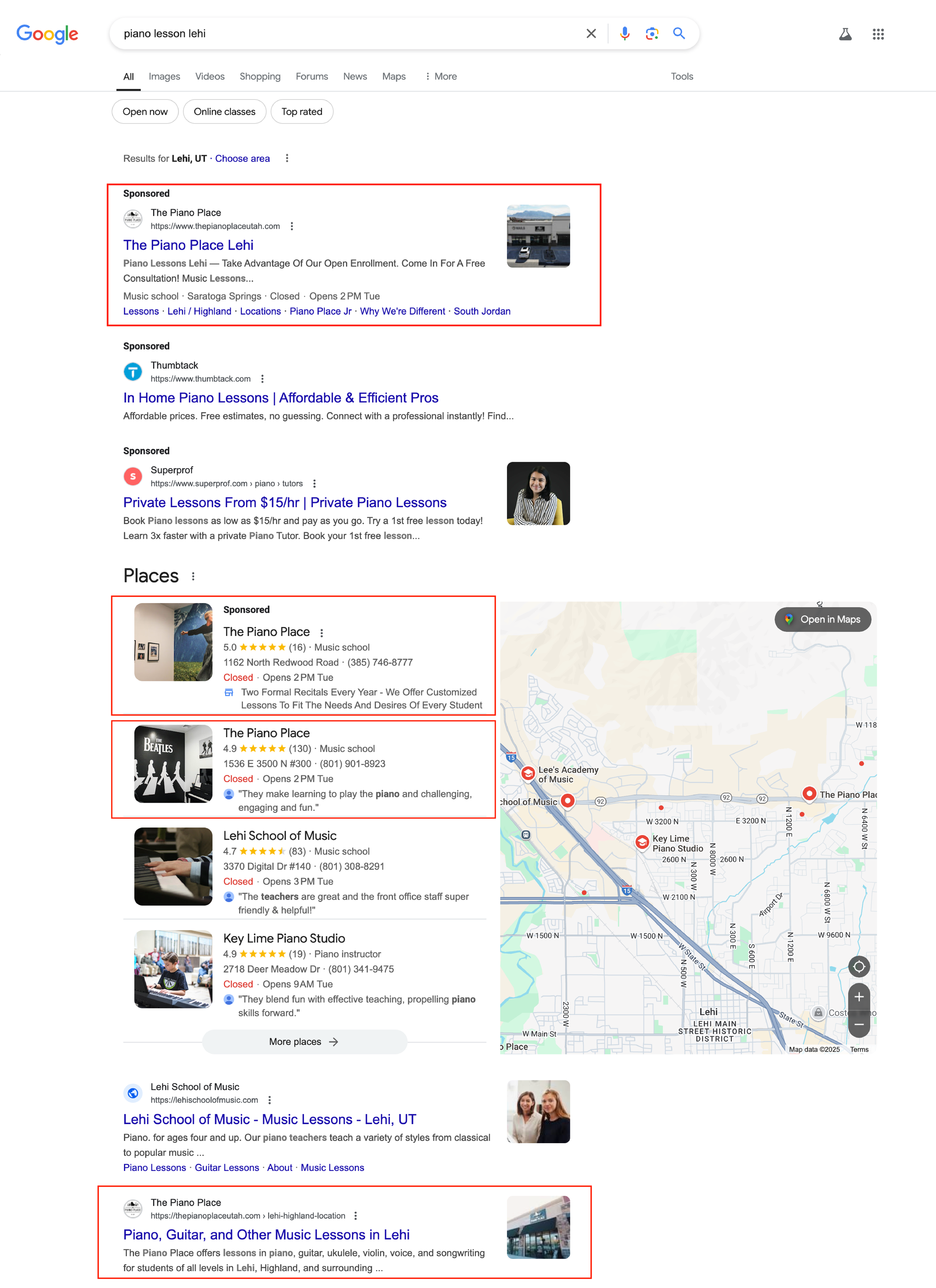 For example, SEO and paid ads can dramatically boost your visibility and bring in quality leads. The process might take a few months to show significant results, but once you're consistently ranking and attracting the right audience, the long-term benefits are priceless. Even with an initial investment, the returns—like increased enrollments and brand recognition—quickly outweigh the costs. We helped The Piano Place rank their Google Ads, organic landing pages, and Google My Business pages in the top spots, driving more visibility and leads to their locations.